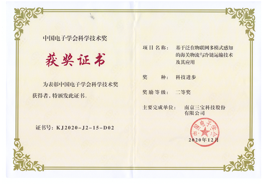近日,從中國電子學會傳來喜訊,我公司與南京郵電大學等單位聯合開展的“基于泛在物聯網多模式感知的海關物流與冷鏈運輸技術及其應用”獲得2020中國電子學會科技進步獎二等獎!受疫情影響,該獎項近日正式頒發。